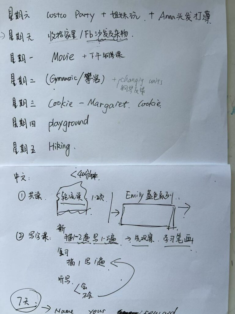 于是我们拿出一张纸,把9天列出来,让她们自己说每天想玩什么。结果发现,大多数天她们想要的其实就是“姐妹一起玩想象游戏、扮家家”——不需要特别安排。但我们还是在此基础上,每天加了一个“special”: