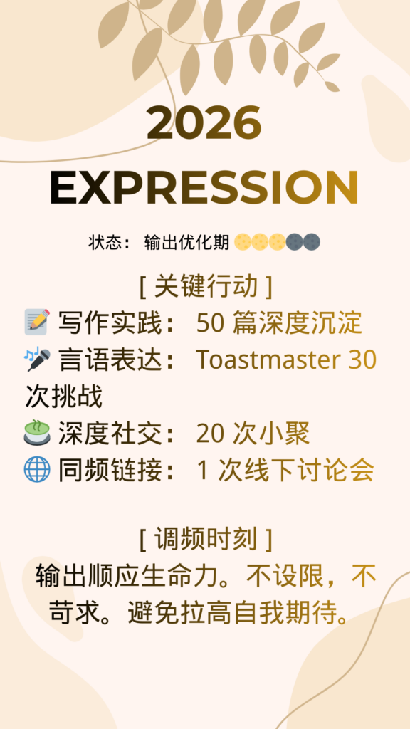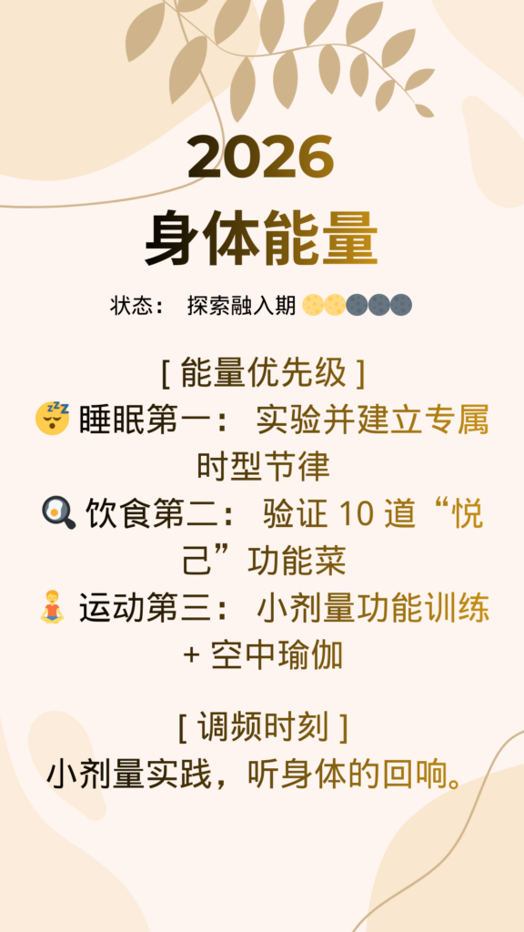 - 为自己写一句“调频心法”:这是当你焦虑或偏离时的提醒。比如我的身体探索是“小剂量,观察反馈”,表达练习是“输出顺应生命力,不为表现所困”。