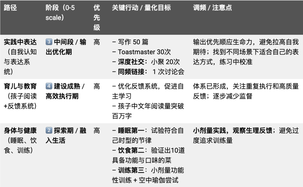 基于以上,我将能量聚焦到最能疏通生命力、最核心的两三个路径上,并为每个评估了“发展阶段”(0-5分),因为这直接决定了行动策略: